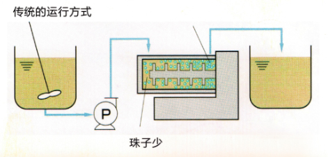 傳統(tǒng)磨機的運行方式 1. 粒度難以控制,分散不充分; 2. 粒度分布往往較寬; 3. 無法控制物料的溫度; 4. 在大流量高速運轉(zhuǎn)時,磨介易聚集在腔體一側(cè),容易堵塞在出料口。 |
