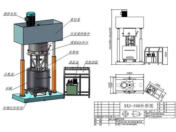 雙行星混合攪拌機是一種對多種液體、粉體進行混合攪拌、溶解、分散、均質的攪拌設備,分為減速電機、封蓋、行星架,高速、低速、活動刮板三軸,刮壁器、料桶、雙柱液壓升降系統(tǒng)、真空系統(tǒng)以及機架等構成。雙行星混合攪拌機能在真空下工作,可不斷的排出水分和其他的揮發(fā)物,因此,可作為脫氣釜使用。料桶可根據(jù)需要采用油、水循環(huán)加熱或冷卻;也可使用蒸汽加熱。加熱溫度通過控制面板上的溫度控制儀顯示。行星分散混合機(行星攪拌機)廣泛應用于高粘度電池、涂料、有機硅膠、油墨、染料、粘膠劑等。